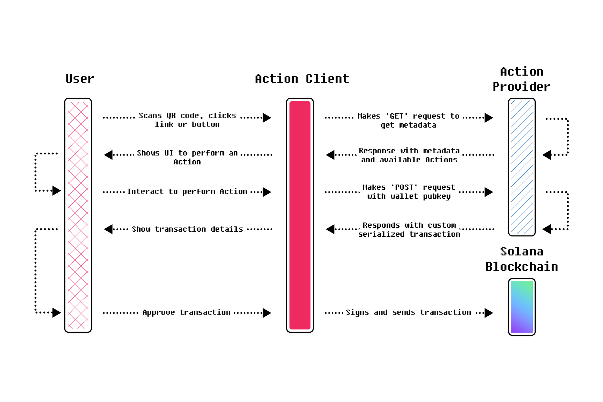 - Inclusion of Action URLs in "Interstitial" Sites or Mobile App Deep Links: For example, https://dial.to/?action=solana-action:https://actions.alice.com/donate.