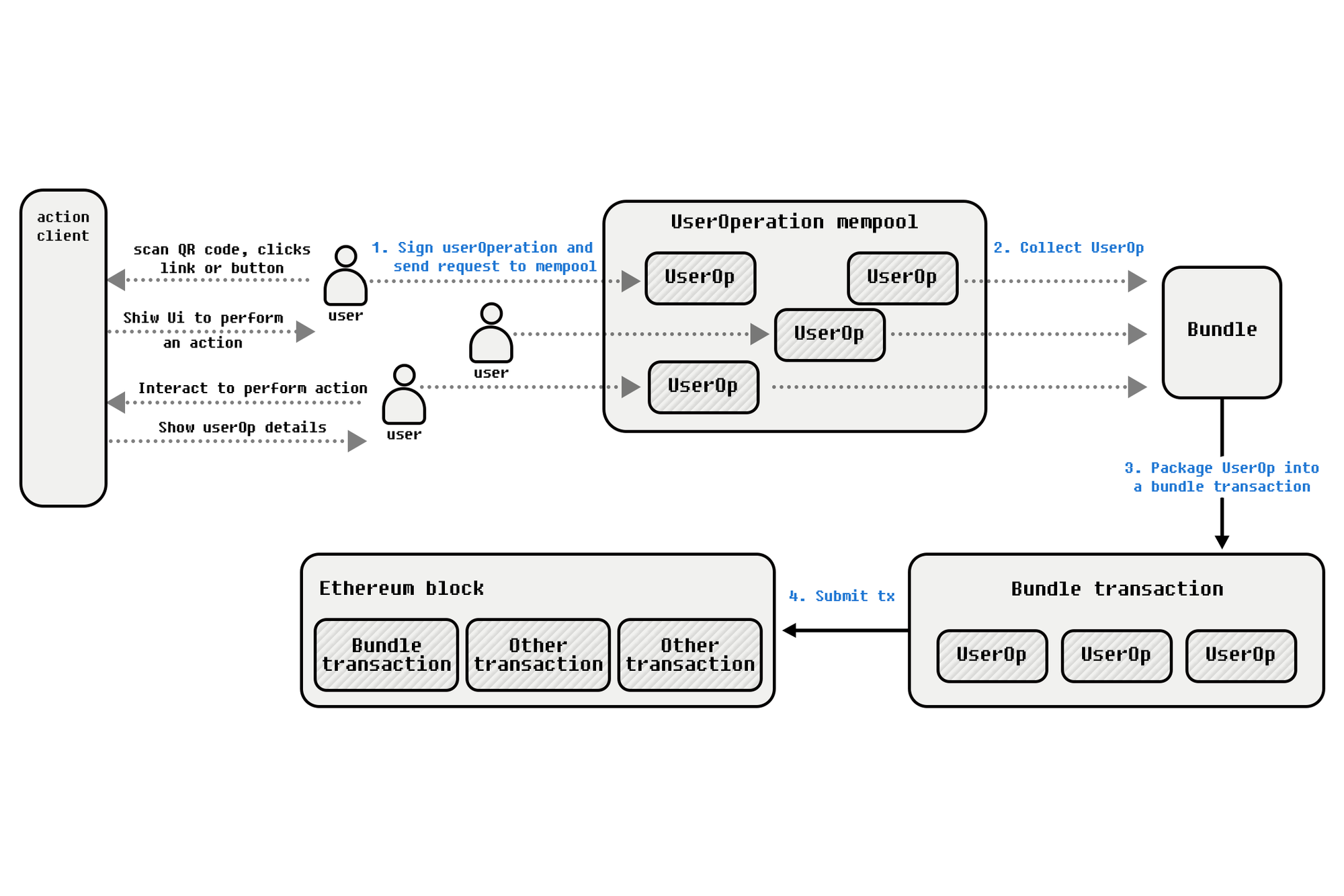 With ERC-4337, the EVM systems can create an environment where User Operations (UserOP) data is generated by the server. This data, including a nonce value, is sent to the user by the Action host. The user then adds the necessary signature for approval and sends the complete bundle to a bundler. This process aligns seamlessly with the Blink and Action model, allowing for full utilization of these tools in the EVM context.