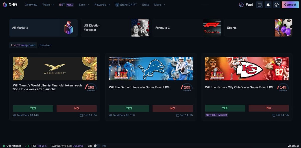 BET on Drift is the first capital-efficient prediction market on Solana, and it introduces unique features that set it apart from other platforms. Leveraging Drift’s borrow/lend capabilities, BET allows users to earn yield on trades automatically. Also, the platform enables “structured bets,” allowing users to hedge by going long on a prediction while shorting assets like Bitcoin, all within a unified ecosystem. Users can also bet on events using a wide range of tokens other than just USDC. With these options, BET aims to become a key player, offering a more incentivized approach to prediction markets by integrating yield generation and diversified asset support in one platform.