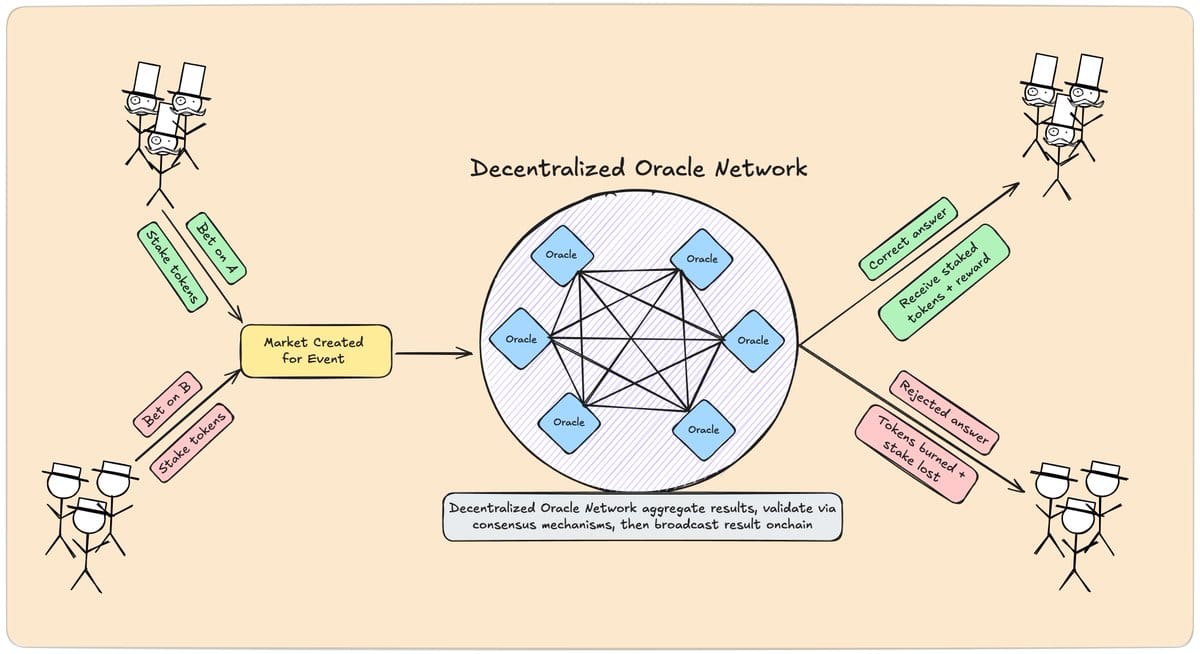 In prediction markets, once the event is over, accurate and timely event verification is essential to distribute payoffs correctly. This is where oracles step in. Oracles serve as intermediaries that bring external, real-world data onto the blockchain, allowing smart contracts to verify outcomes and settle markets. For quantitative events, like those based on price feeds, oracles can quickly provide up-to-date data. However, for non-quantitative events (e.g., the outcome of a sports game or election), decentralized oracle networks are implemented, with decentralized consensus mechanisms or human input from trusted reporters to determine results.