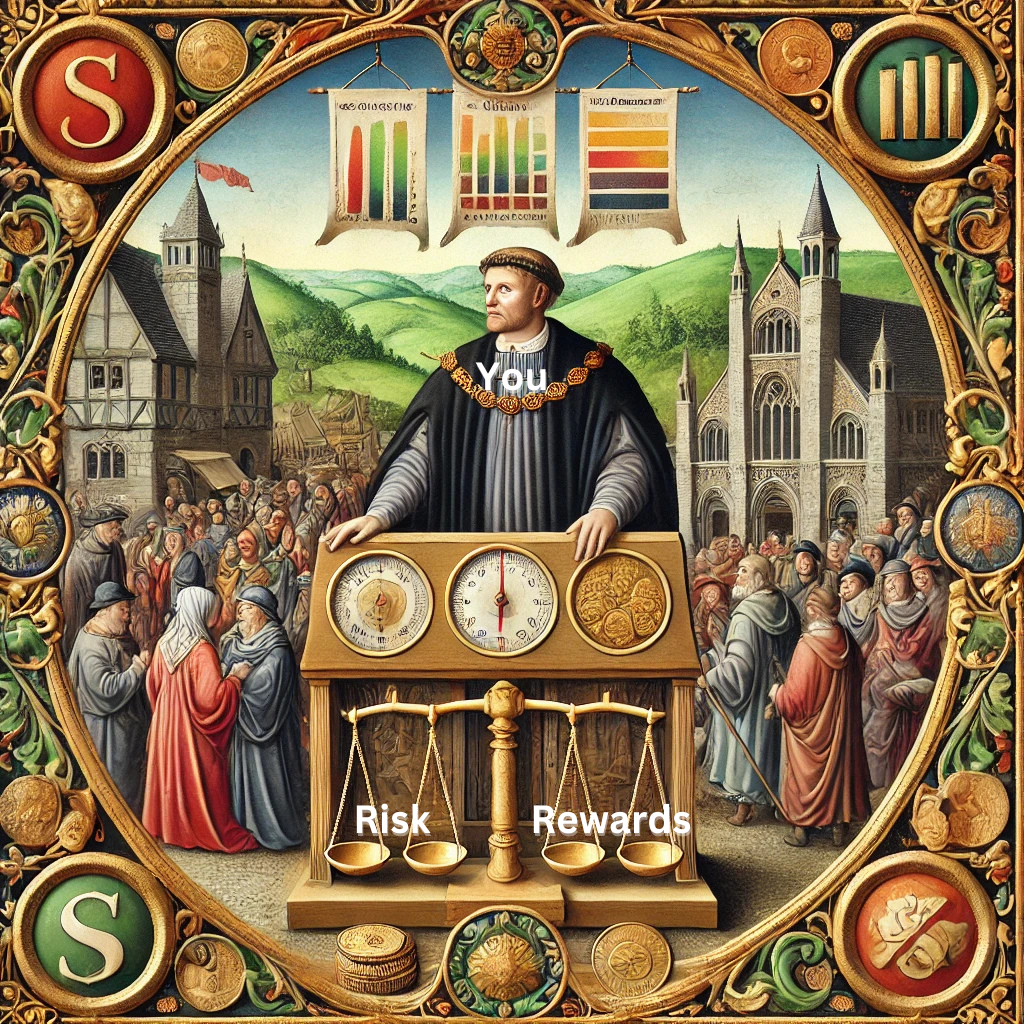 Active Management: Risk and Rewards. {possibly image of scale medieval person in a market or something}