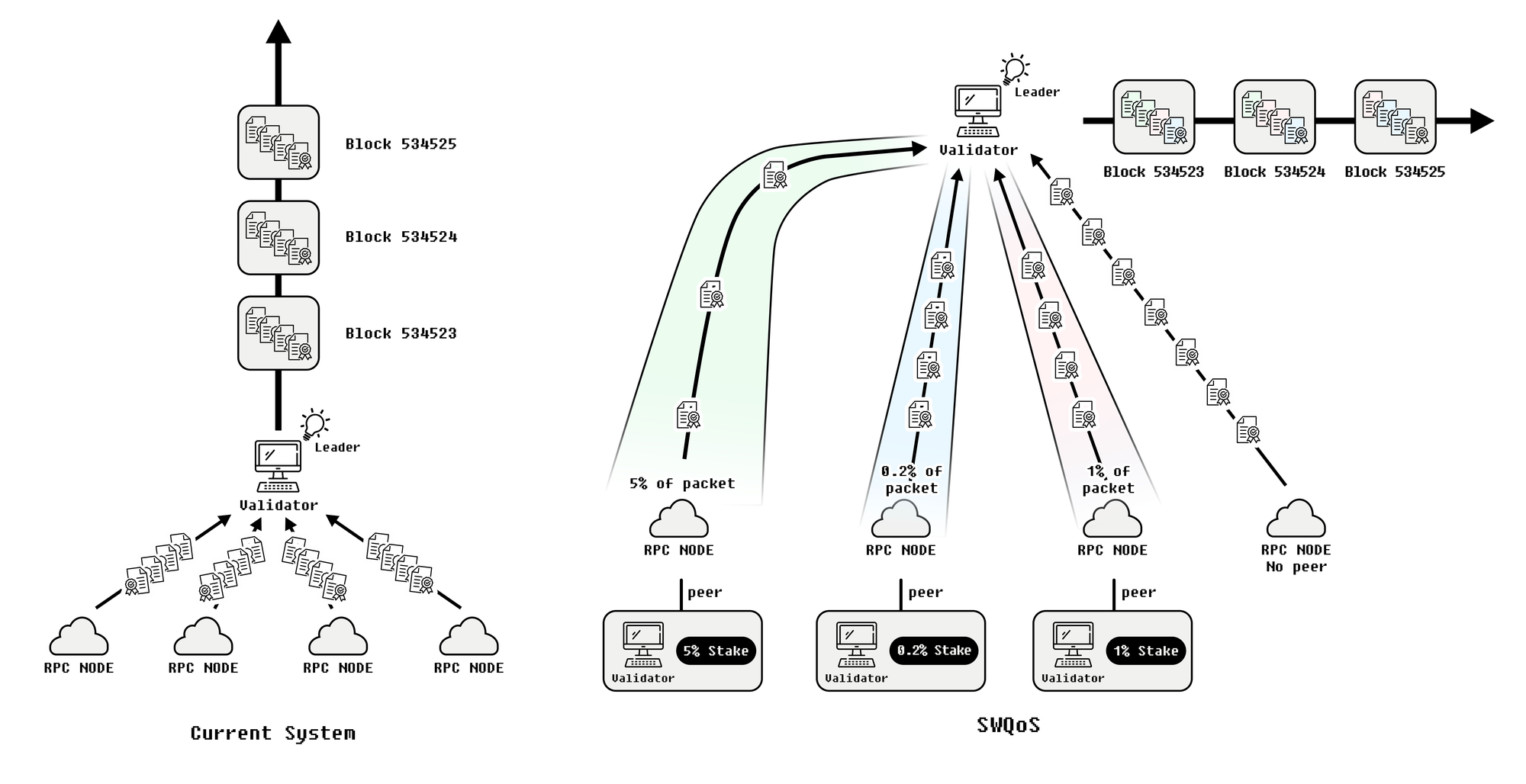 Several solutions are currently discussed in the Solana ecosystem to address these issues. SWQoS (Stake Weighted Quality of Service) suggests partially compromising permissionless transaction transmission to gain advantages in real-time processing and anti-spamming. RPC and Validators form peer relationships, where RPC nodes relay transactions weighted by validator stakes. Transactions relayed through RPC nodes with higher stake validators have a higher chance of reaching leader validators and being executed. However, this could lead to a situation where only transactions from highly staked validators' peers are prioritized, creating a quasi-permissioned environment. High-frequency trading and arbitrage companies might monopolize transaction execution, disadvantaging retail users who might face higher costs. In an extreme scenario, this could potentially lead to a dystopia where a few entities monopolize network usage.