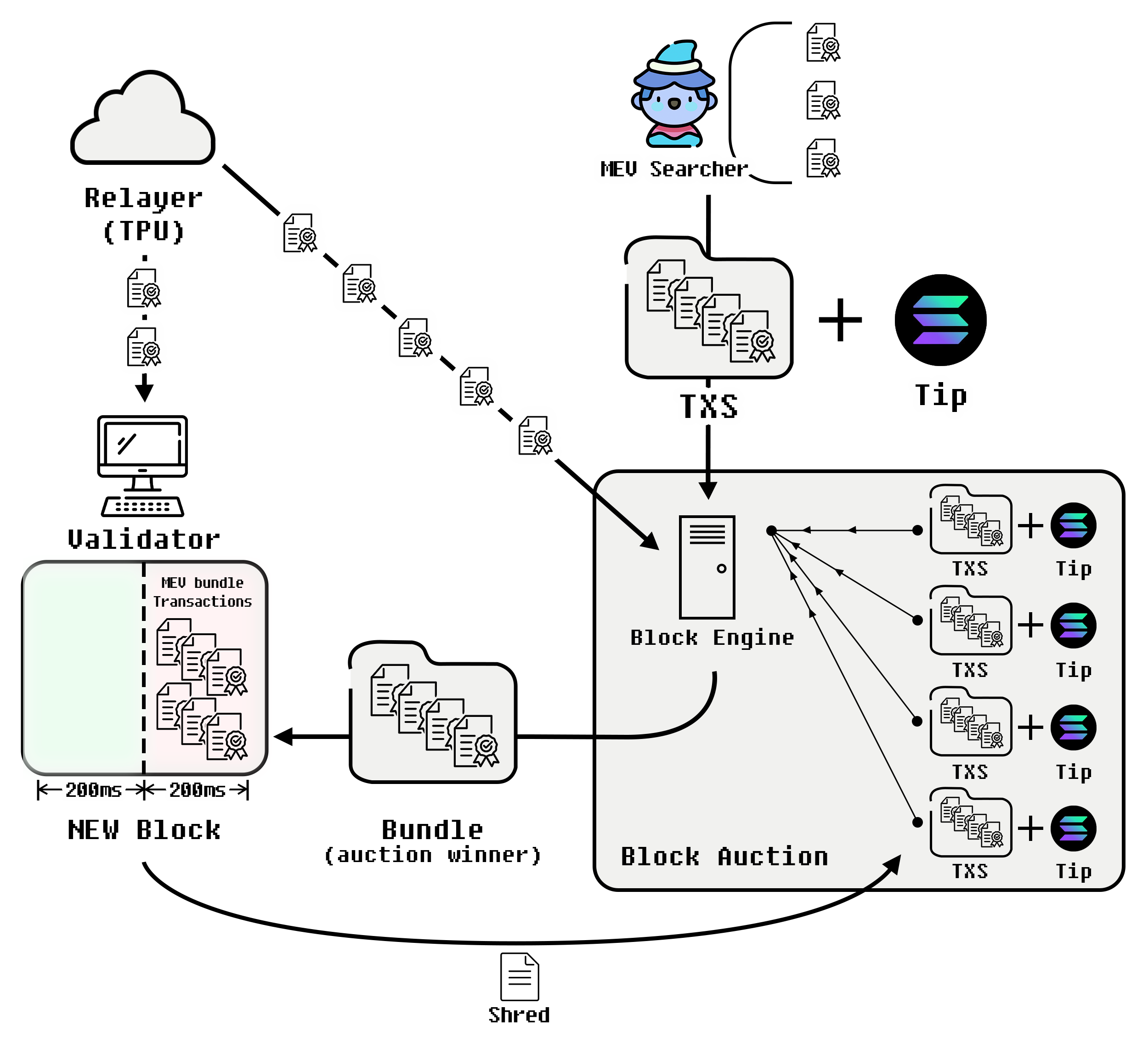 Jito Labs, another proposed solution, focuses on enabling MEV (Maximal Extractable Value) on the Solana network through specialized clients. MEV searchers identify opportunities and generate bundles, which are then auctioned off to leader validators running the Jito client. The highest bidding bundles are included in blocks, pausing block creation for 200ms during the auction. However, only 25% of validators currently run the Jito client, and broader adoption requires it to be more cost-effective than spamming.