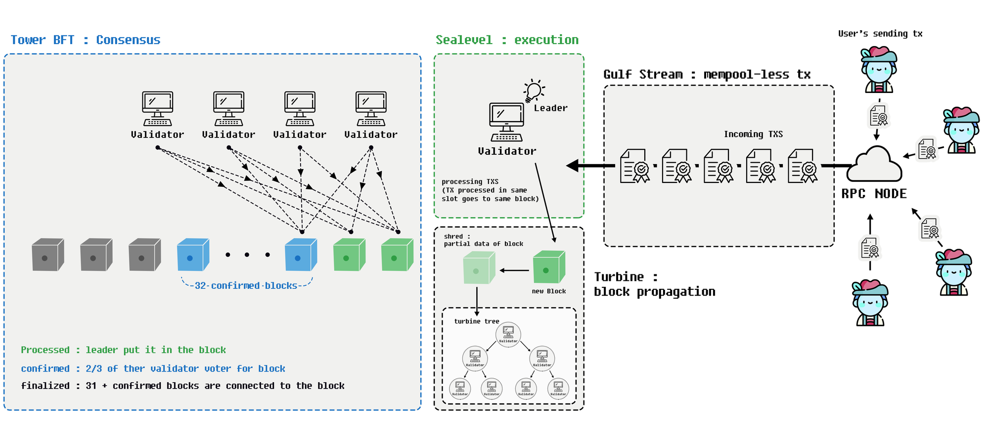 Solana employs a unique system that leader validators continuously execute incoming transactions, create blocks and propagate them. Validators then vote on these blocks, and once the votes surpass the Tower BFT threshold, the blocks are confirmed. Unlike Ethereum, Solana transactions do not have a nonce; instead validity is checked through a recent block hash, which does not influence execution order. RPC nodes relay user transactions to leader validators using UDP (QUIC) to ensure timely execution before expiration. This system allows Solana to maintain a mempool-less blockchain, achieving 0.4-second block creation times and real-time transaction processing.