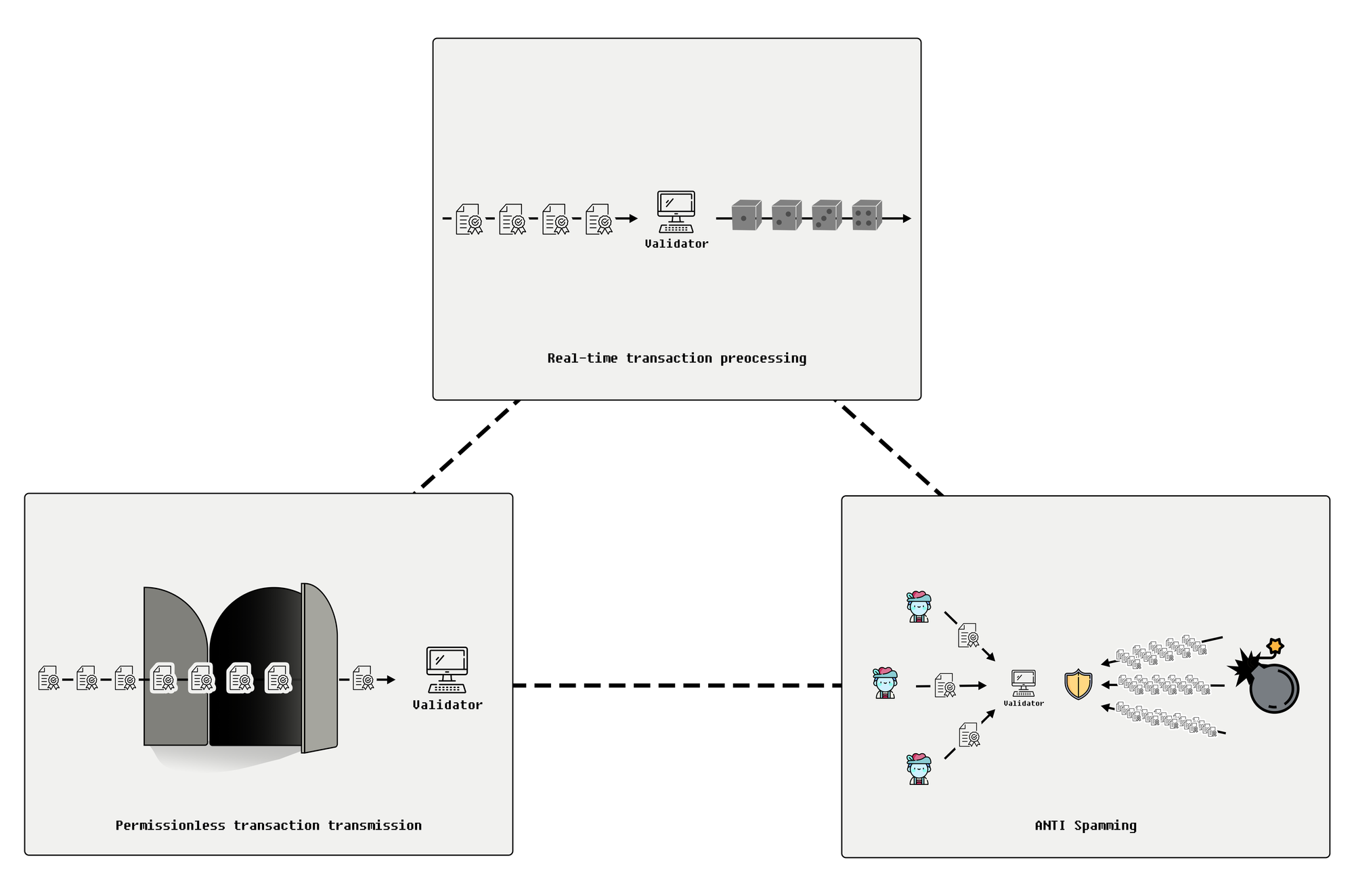 However, this unique system structure has led to a new problem: spamming. Solana's efficiency and speed, combined with low fees and the absence of a mempool, make the network an attractive target for bots incentivized to send a tons of transactions for substantial economic rewards. This phenomenon can be described through the Solana trilemma: permissionless transaction transmission, real-time transaction processing, and anti-spamming. These three aspects cannot all be fully satisfied simultaneously.